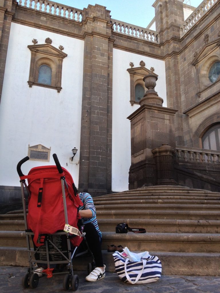 Tesadüfen, arabada GPS olmamasına rağmen yolumuzu bulduk başkent ve büyük şehir Las Palmas’ta. Deniz kıyısından uzanan iki şeritli geniş cadde bize Konak-Üçkuyular ve Bostancı-Maltepe sahil yollarını hatırlattı. Tabii en büyük fark, Las Palmas’da yanyana dizili palmiye ağaçlarıydı. Şansımıza Plaza de Santa Ana’ya ve Christopher Columbus’ House yani Kristof Kolomb’un evine yakın bir sokağa arabayı parkettik. Uyuyan Alaz’ı pusetine yerleştirip tarihi meydana ve Katedral’e doğru ilerledik. Elbette Alaz masum masum etrafa bakınıyordu uykulu gözlerle. Tabii Kristof Kolomb’un kaldığı eve, Casa de Colon’a girdiğimizde kucak istedi. Kucakladığım an bezini değiştirmemiz gerektiğini fark ettim. Malesef civardaki tuvaletlerde bez değiştirmek için yer yoktu. Ben de Katedral merdivenlerine oturdum ve işe giriştim. Babasının da yardımıyla pusetin içinde yatarken değiştirdim altını, ne kadar zordur tahmin edersiniz! Geçen Mayıs ayında Ortaköy’den Beşiktaş’a ilerlerken aynı işi aynı şekilde yapmış olmamız gözümde canlandı. Tabii o zamanlar bebekti ve yatırdığımızda rahat rahat sığıyordu pusete.