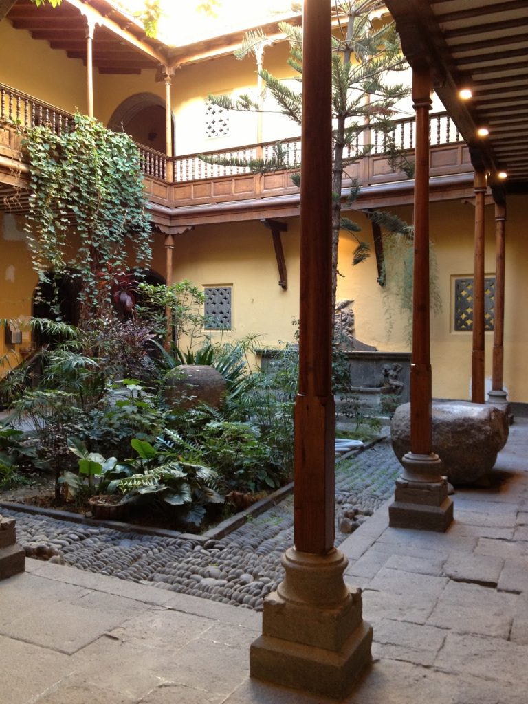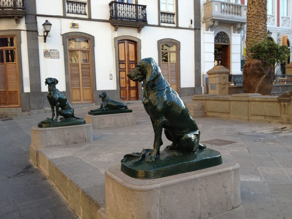 Daha sonra Katedrale ve Santa Ana meydanına gittik. Bronz köpek heykelleri meydanın en önemli simgesi. Kanarya Adaları isminin sarı kanarya kuşlarından geldiği düşünülür hep. Oysaki eski çağda Romalılar adalardan birinde yüzlerce vahşi köpek görüyor ve adaları Insula Canum olarak adlandırıyor. Sonraları adada yabani saka kuşlarının olduğu farkediliyor ve adaya ‘Dog Island Birds’ yani köpek adası kuşları deniliyor. Tabii ada daha sonraları Fortunate Islands olarak biliniyor. Adanın adının kendilerini Canarii olarak adlandıran bir çeteden geldiği de öne sürülmekte. Köpekler de Kanarya Adaları’nın bayraklarında yeralan bir simge.