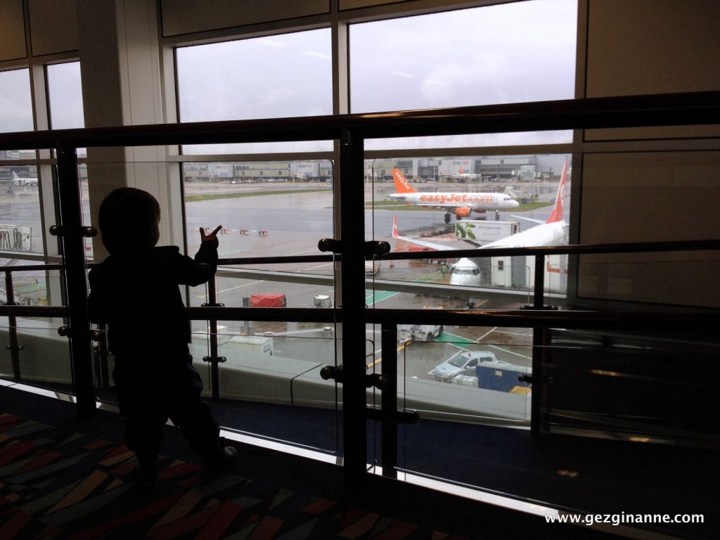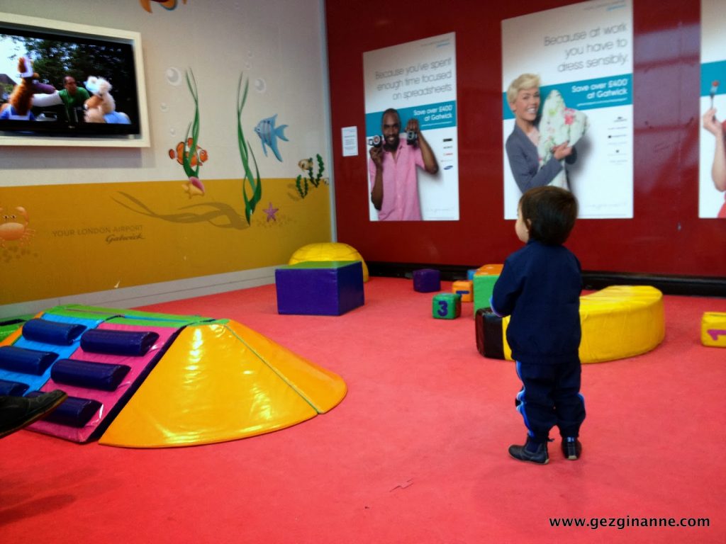 Gatwick North Terminal’de check-in işlemimizi hallettikten ve güvenlik kontrolden geçtikten sonra family area dedikleri bölüme gittik. Alaz kah yumuşak minderlerle oynadı, kah BBC’den çizgi film izledi.