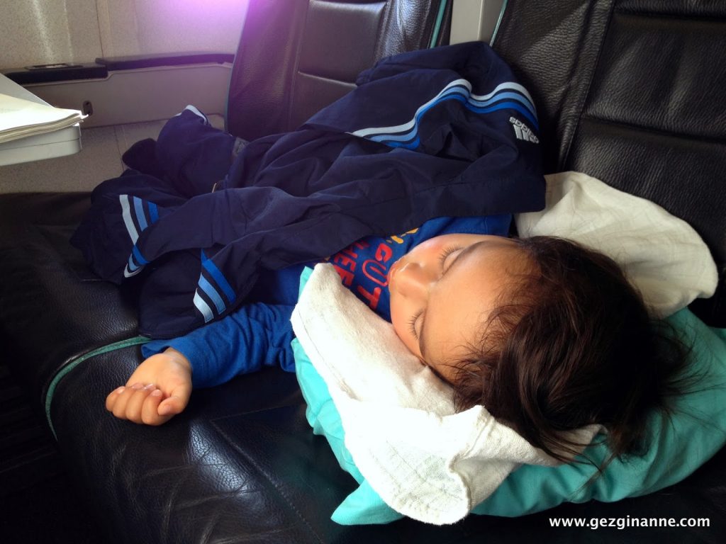 Bebekliğinden beri uçak kalkmadan, pistte ilerlerken uyuyakalır. Tabii bunda uçak kalkış saatini uyku saatine denk getirmemizin de payı büyük. Yolda iki saat uyudu.
