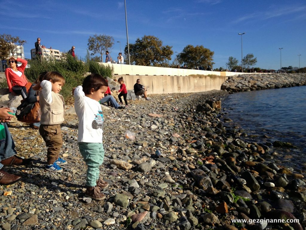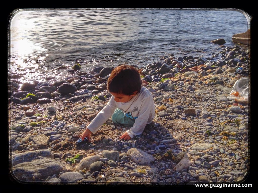 Sahilde yürüyüş ardından, kayıkların bulunduğu açıklıkta denize taş attılar. Yerde bulduğu bir oyuncak arabayla uzun uzun oynadı ilk resimde görüldüğü üzere.