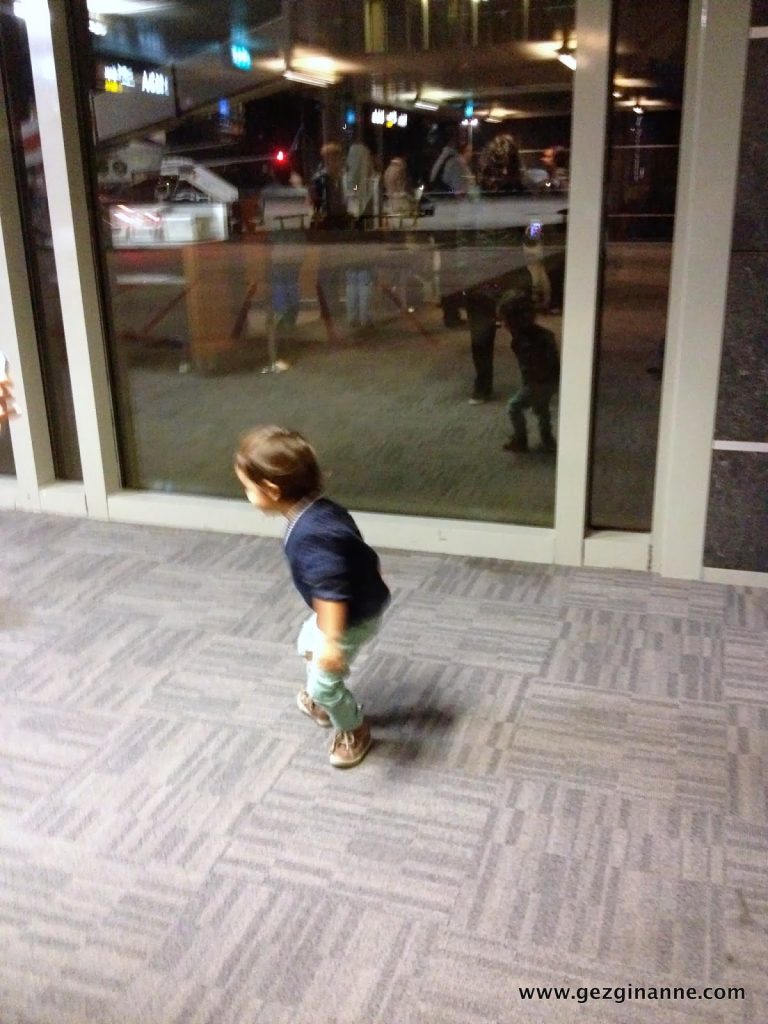 Akşamında gene havaalanının yolunu tuttuk. Sabiha Gökçen’den kalkacak uçağımız önce yarım saat rötar yaptı, sonra büyük bir felaketten ucuz kurtulduk. Daha sonra yazacağım. Bu nedenle yaklaşık 5 saat havaalanının bekleme salonundaydık. Bu resim de geceyarısına doğru, Alaz’ın yorgunluktan çıldırdığı anlardan biri.